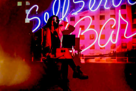 silhouette of a young beautiful woman on the background of neon projector inscriptions, slight blur