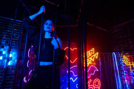 Fashion portrait of a young woman in sunglasses posing near neon signs in night club