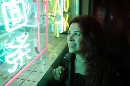 Image of asian happy positive smiling pretty beautiful young woman posing over neon lights.