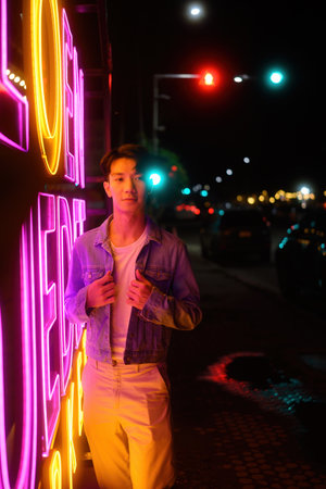 Stylish Young Man in Denim Jacket at Neon Sign, Urban Night Portrait with Neon Glow.