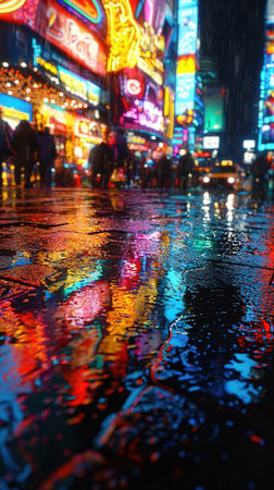 A captivating image of a city street at night, showcasing vibrant neon lights reflected in a wet pavement. A lone figure walks in the distance.