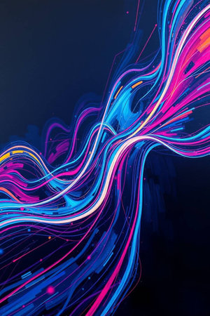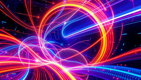 Colorful light trails in motion, vibrant neon streaks creating an energetic and dynamic abstract background