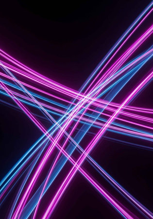 Dynamic, intersecting light trails in neon pink and blue against a dark background.