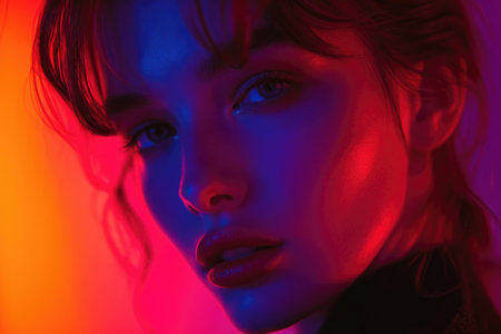 A young woman with bright orange hair stands against a softly glowing neon backdrop her expression both fierce and serene as the colors wrap around her enhancing her unique style..