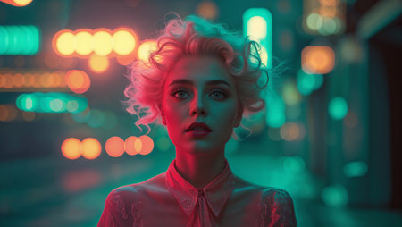 Fashionable woman with styled blonde hair posing in urban nightlife setting, illuminated by vibrant neon lights. Ai generated image
