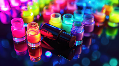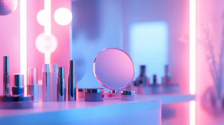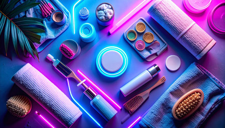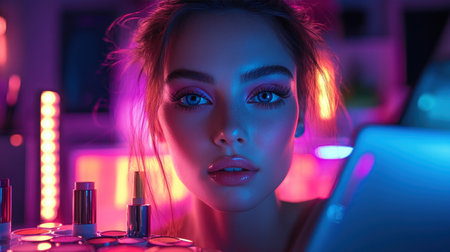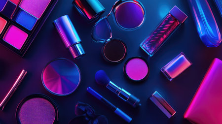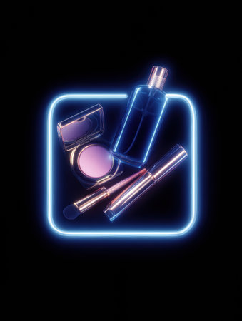 Stunning cosmetic collection displayed with vibrant neon glow, perfect for beauty campaigns and product showcases