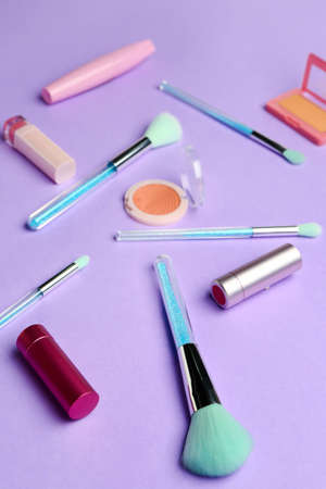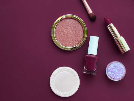 Beauty, make-up and cosmetics flatlay design with copyspace, cosmetic products and makeup tools on purple background, girly and feminine style concept
