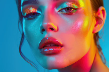 Vibrant makeup look with high-gloss finish and colorful lighting on a woman's face, creating a surreal modern vibe
