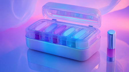 A sleek display of modern skincare products on a glass surface, illuminated by neon lights in blue and pink. The futuristic setting highlights innovation and the premium quality of beauty products.