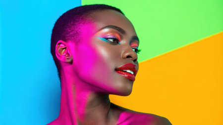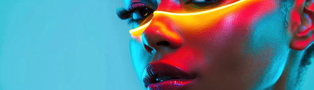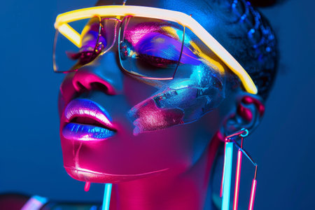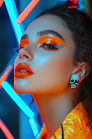 A closeup of a womans face with vibrant neon makeup, embodying bold fashion and artistic expression