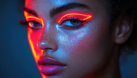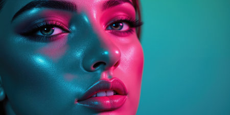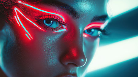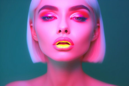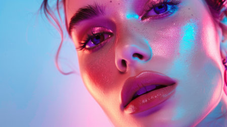 A captivating portrait featuring young woman with striking blue eyes and glossy lips, illuminated by vibrant neon lights..