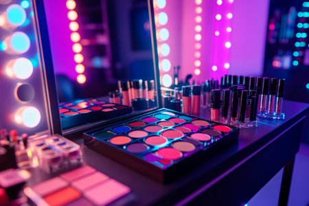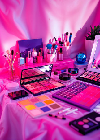 A captivating close-up of a beautifully arranged makeup display, featuring colorful products and inviting reflections, ideal for beauty and fashion themes.