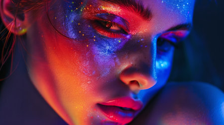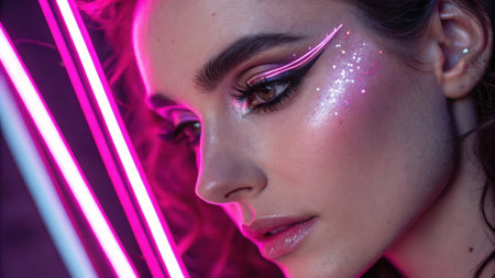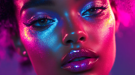This striking image showcases vibrant makeup artistry featuring glitter and neon colors designed to captivate and inspire. Perfect for beauty enthusiasts.