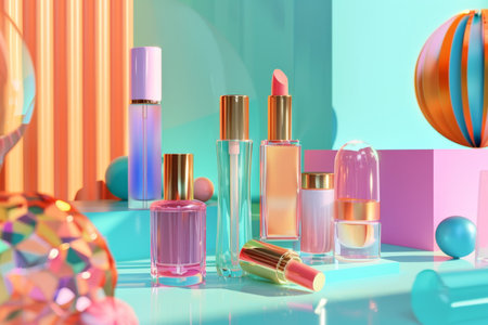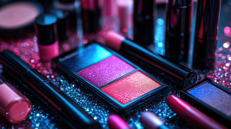 A vibrant close up of cosmetics product display featuring colorful lipsticks and eyeshadow palettes, creating glamorous and playful atmosphere..