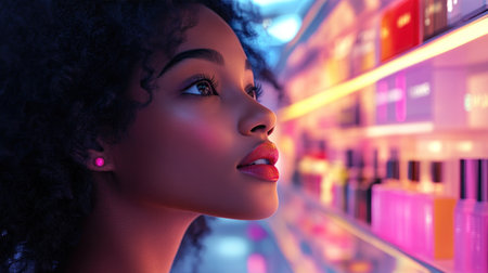 A dynamic illustration featuring woman admiring beauty products in vibrant setting. colorful display enhances emotional expression of curiosity and wonder..