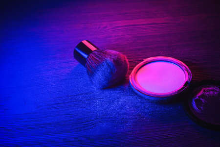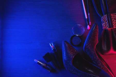 Eyeshadows palette, lipstick, high heels shoes and makeup brushes in the neon lights background with copy space.