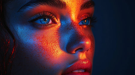 Close-up of a woman with radiant skin illuminated by vibrant light patterns creating a stunning visual effect.