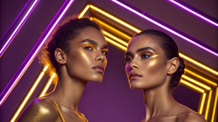 Bold Statement The models brows and cheekbones are accentuated with metallic gold that reflects the striking neon purple and gold lights creating a powerful presence in the frame..