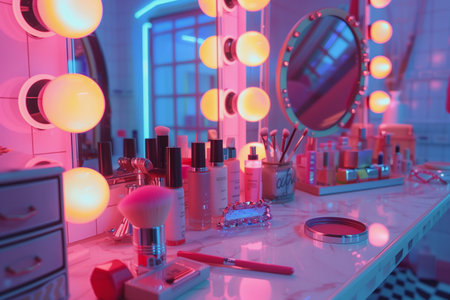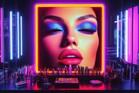 A woman's face is displayed on a neon sign. The sign is surrounded by bright lights and is placed in a room with many makeup products. Scene is energetic and vibrant, as the neon sign