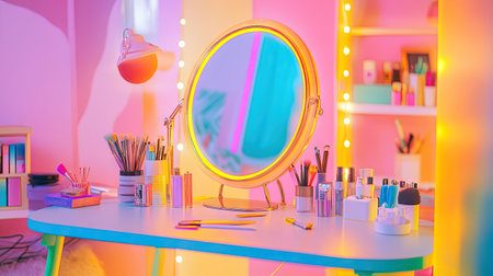 Stylish and modern vanity setup featuring makeup products, a round mirror, and neon pink and blue lighting, creating a chic aesthetic.