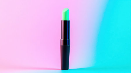 A striking green lipstick stands prominently against a vibrant gradient background, showcasing contemporary beauty trends and offering inspiration for makeup enthusiasts and professionals.