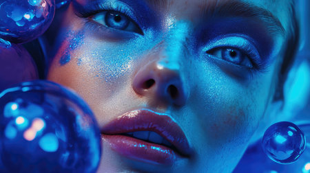 Stunning portrait of a woman with dazzling makeup and vibrant lighting in an artistic studio setting