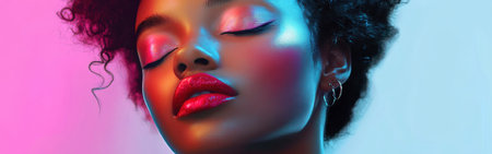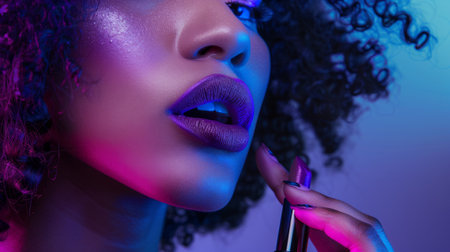 A serene moment captures a woman with glowing features enhanced by radiant lipstick and shimmering blush. Colorful lighting emphasizes her beauty, creating a captivating effect.