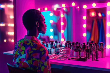 A teenager explores her creativity with makeup in a colorful space filled with bright lights and a vibrant palette, showcasing youthful expression and style.