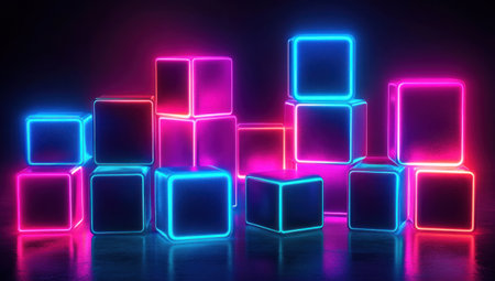 A set of glowing neon cubes stacked in a random pattern, casting reflections on a dark mirrored surface, created by ai