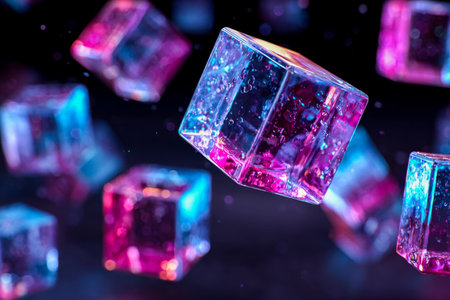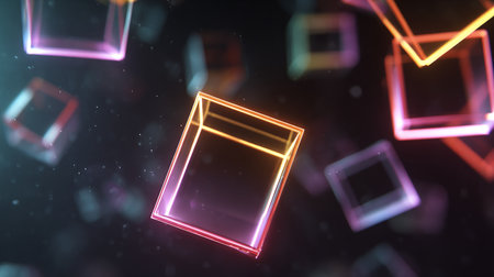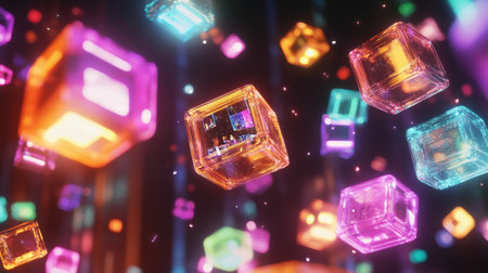 An artistic rendering of several translucent cubes floating in space, with vibrant colors and intricate details, creating a futuristic and abstract visual.