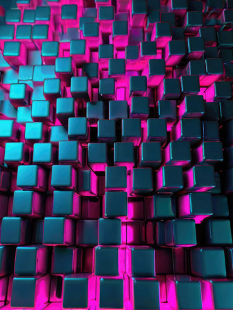 A close-up view of numerous glossy teal cubes illuminated with vibrant pink lighting creating a complex geometric pattern.