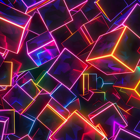 Futuristic neon geometric shapes glowing against a dark background, creating a sci-fi atmosphere with bright, vibrant colors.