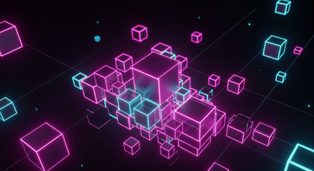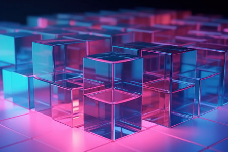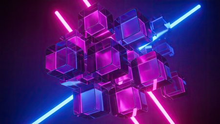 A collection of interconnected, translucent cubes illuminated with vibrant magenta and blue neon lighting dominates the image. The composition features a complex geometric arrangement set against a dark backdrop. Suitable for various design projects, this visually striking artwork offers potential for commercial and artistic applications.