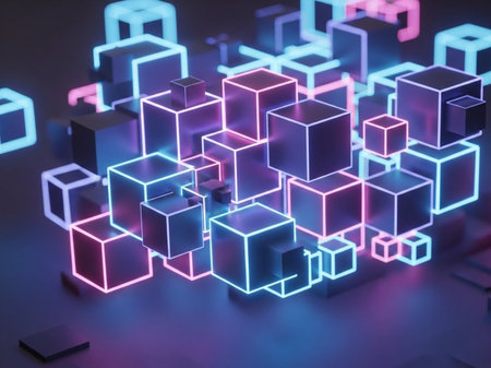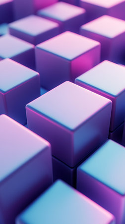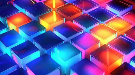 Futuristic minimalistic background features floating 3D cubes painted in vibrant colors, reflecting softly against a neon gradient backdrop, creating depth.
