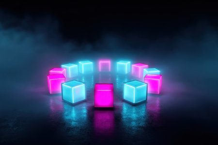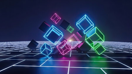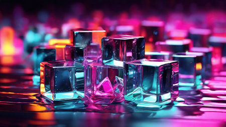 A collection of glowing, colorful cubes suspended in a dynamic, digitally rendered environment, illuminated by bright neon lights.