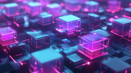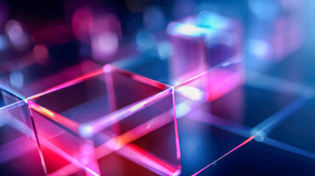 A sleek 3D abstract background featuring floating transparent cubes glowing with soft neon reflections. The high-tech futuristic atmosphere is enhanced by seamless gradients and intricate details.