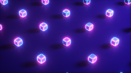 3d rendering of abstract geometric background with neon glowing cubes and lines