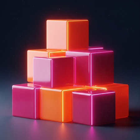 A stack of glossy, geometric cubes in vibrant pink, orange, and red hues, outlined with bright neon light against a dark background.