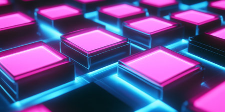 This image showcases a grid of dark squares illuminated by vibrant blue and pink neon light. The composition features a perspective view, highlighting the geometric pattern. The style is modern, with a focus on color and texture, suitable for various design projects and digital art applications.