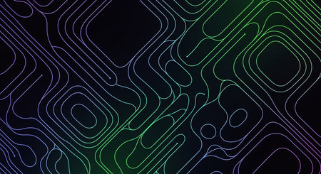This image features an abstract design of glowing lines resembling a circuit board layout. The composition utilizes vibrant colors like blue, yellow, and red against a dark background, creating a visual contrast. The graphic style suggests a modern technological theme suitable for various digital and commercial applications.