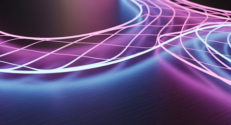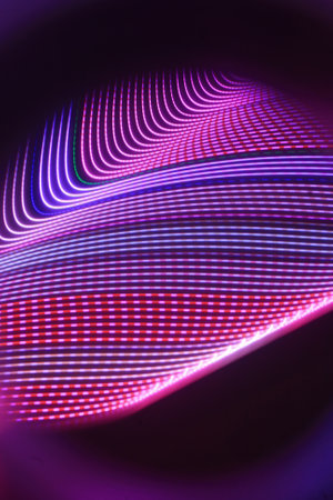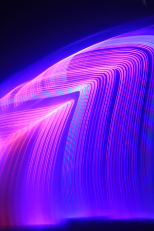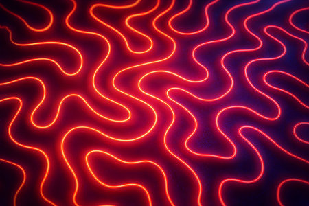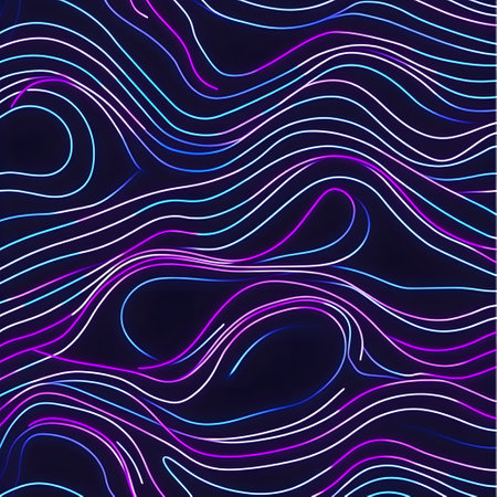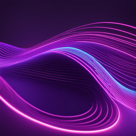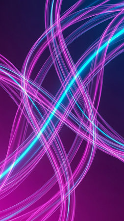 This image features a vibrant, abstract design with neon-like waves. The composition utilizes a dark backdrop that contrasts with the bright, curving lines in shades of purple and blue. It could be used for various commercial projects and editorial content needing a modern and dynamic visual element.