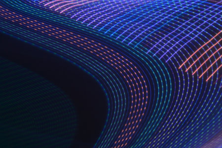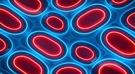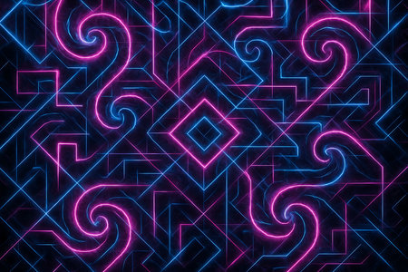 The artwork features a bold, futuristic aesthetic with a vibrant color scheme, ideal for enhancing digital interfaces or creating eye-catching print designs. Its seamless texture makes it suitable for wrapping products or as a backdrop in tech-themed presentations. This piece appeals to graphic designers and tech industry professionals seeking modern visual elements. AI-generated illustration.