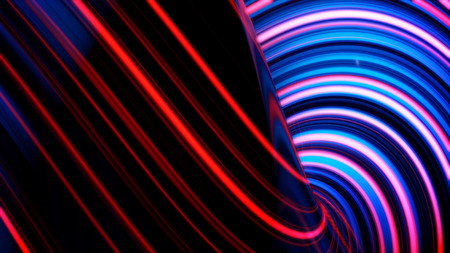 Colorful pink and blue neon spiral lines.Abstract background of blue neon glowing light shapes. Bright stripes for poster, website, brochure, print.