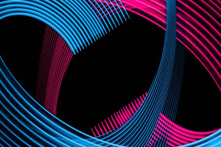 Abstract light painting on a black background, close-up of photo. Glowing blue and red thread, twisting wire, structural, curved electroluminescent cable, Neon wire.