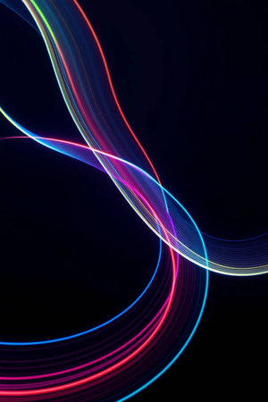 This captivating image features vibrant neon light trails meandering through a dark space, enhanced by sparkling elements. Perfect for modern designs.