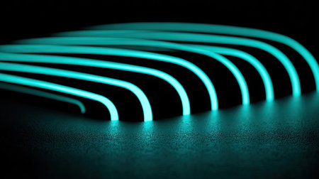 A series of curved, glowing turquoise lines create an abstract pattern against a stark black background. The image showcases bright, neon-like illumination, suggesting a futuristic or technological theme. The composition is clean and minimalist, potentially suitable for various commercial design projects and visual presentations.