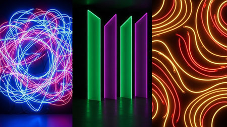 A collage of abstract neon light sculptures featuring swirling lines, geometric shapes, and vibrant colors against dark backgrounds.