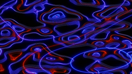Abstract dark background with glowing neon contour lines forming intricate organic shapes and patterns.