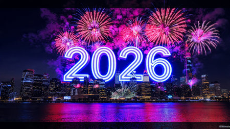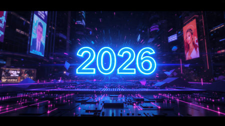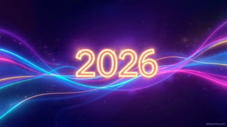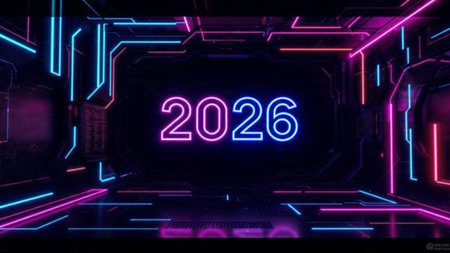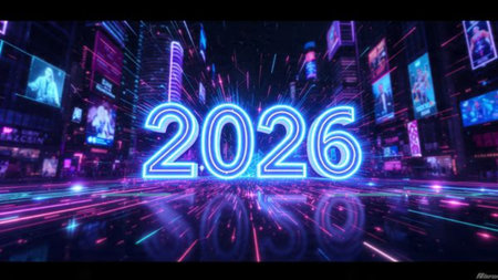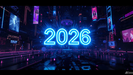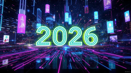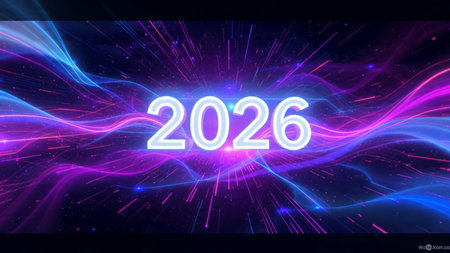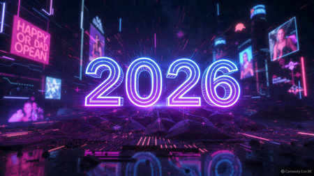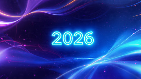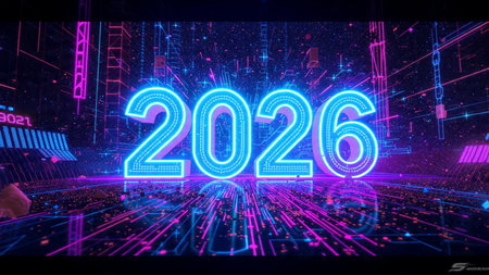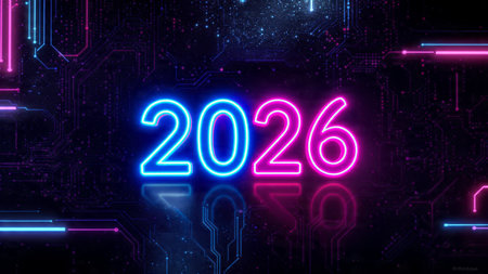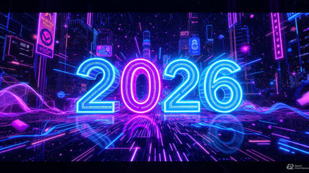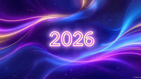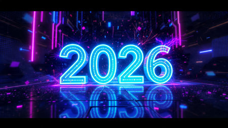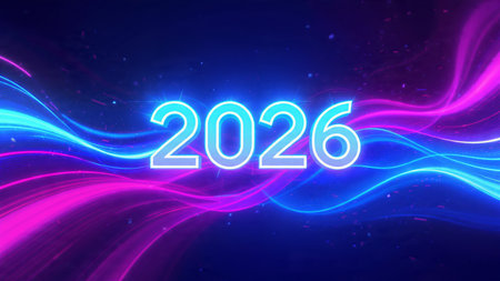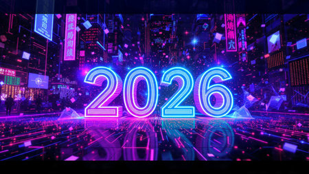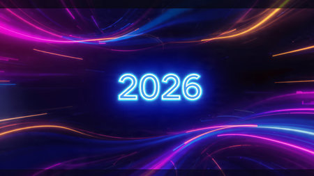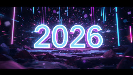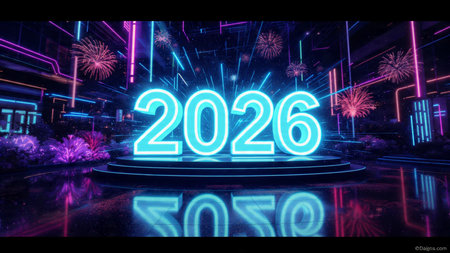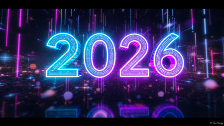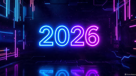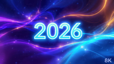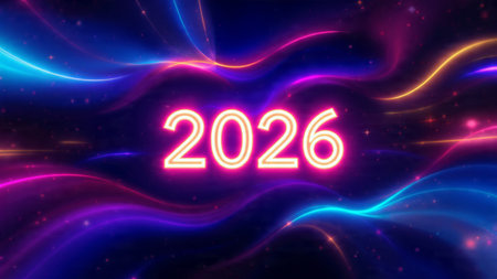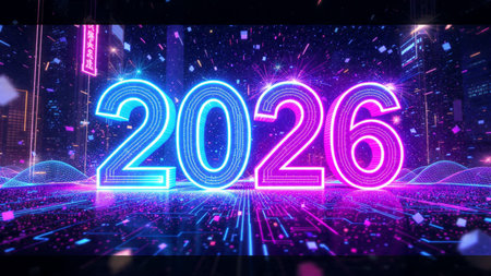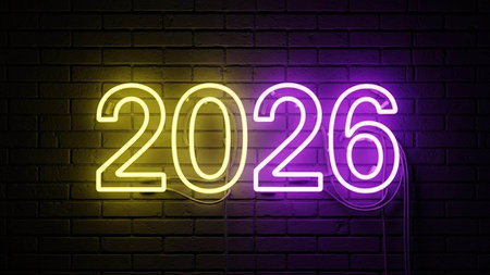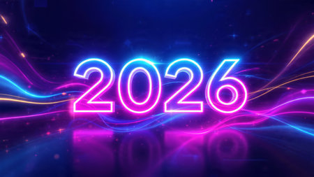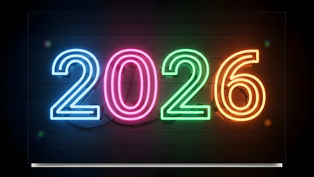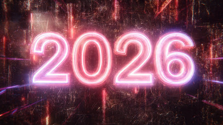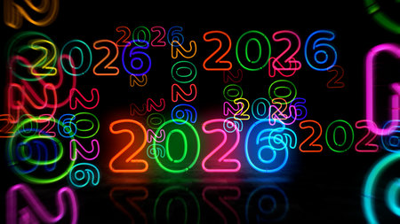 Bright neon numbers 2026 in various colors glow on a dark background. Clear details and vibrant c...
