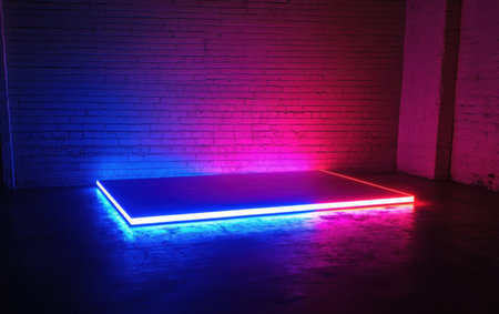 A simple rectangular platform with neon lights on the floor, illuminated by blue and purple light against an old brick wall background. The scene is set in a dark room, creating a dramatic atmosphere. --ar 8:5 --v 6.1 Job ID: 9ab27222-b898-45ae-8c57-6b8947e1fe0c